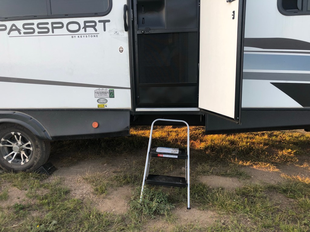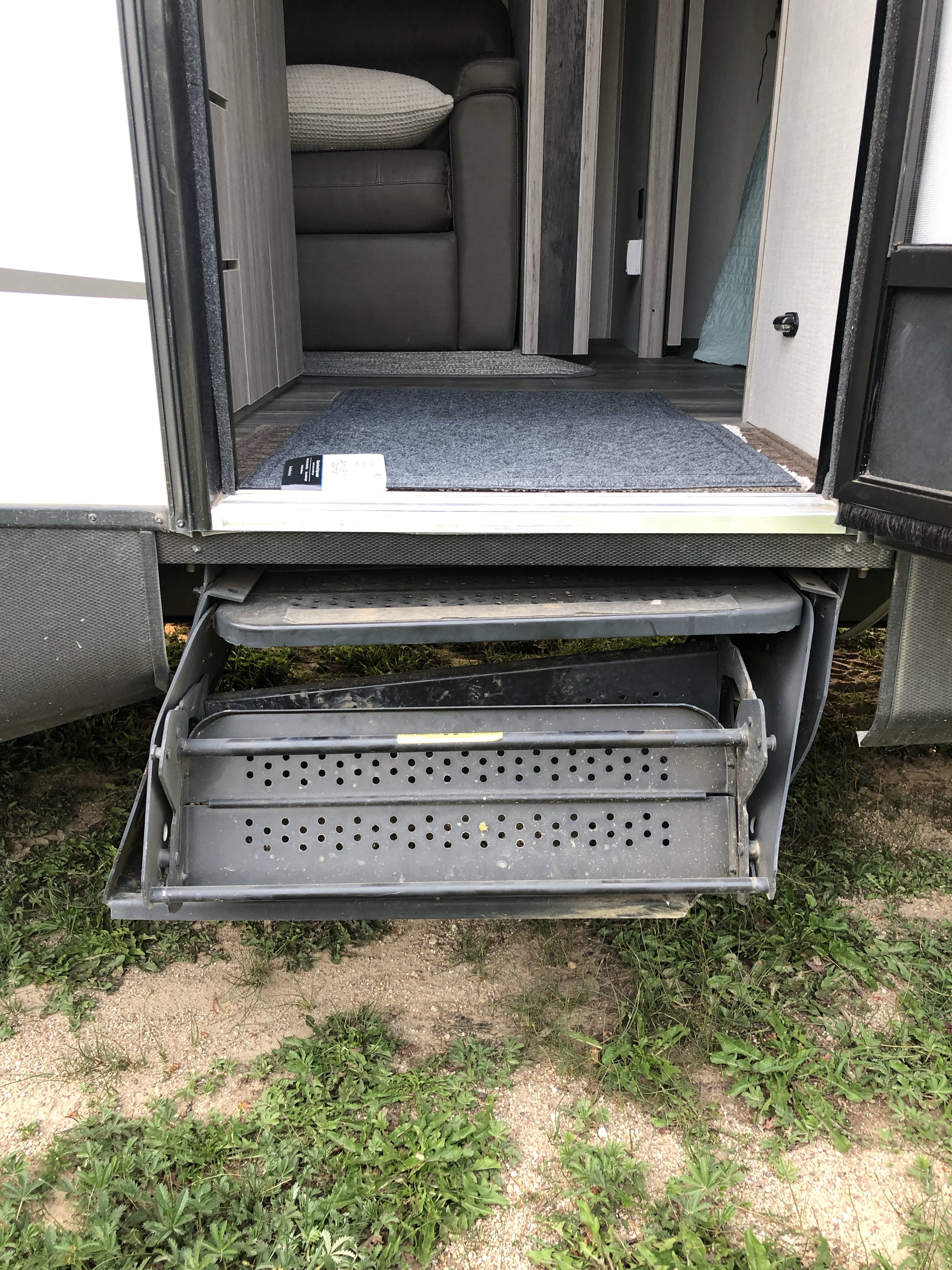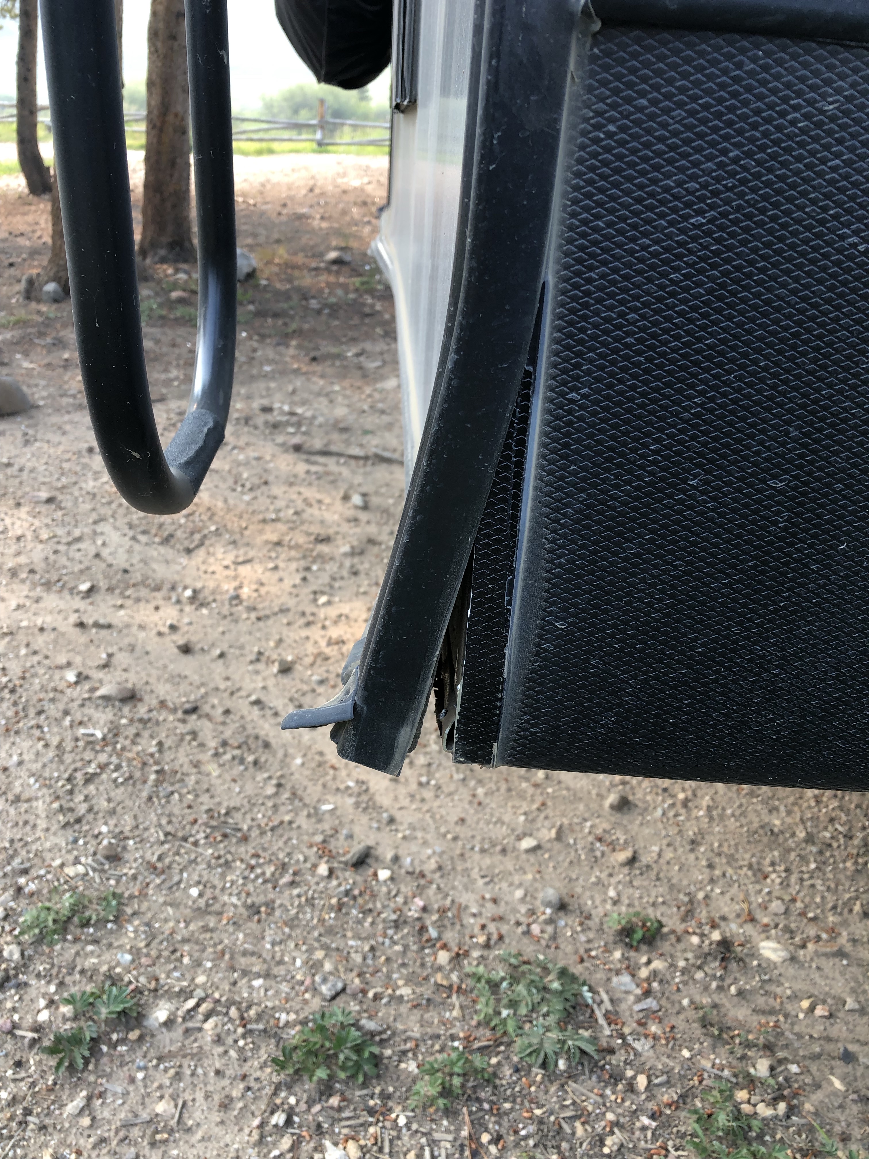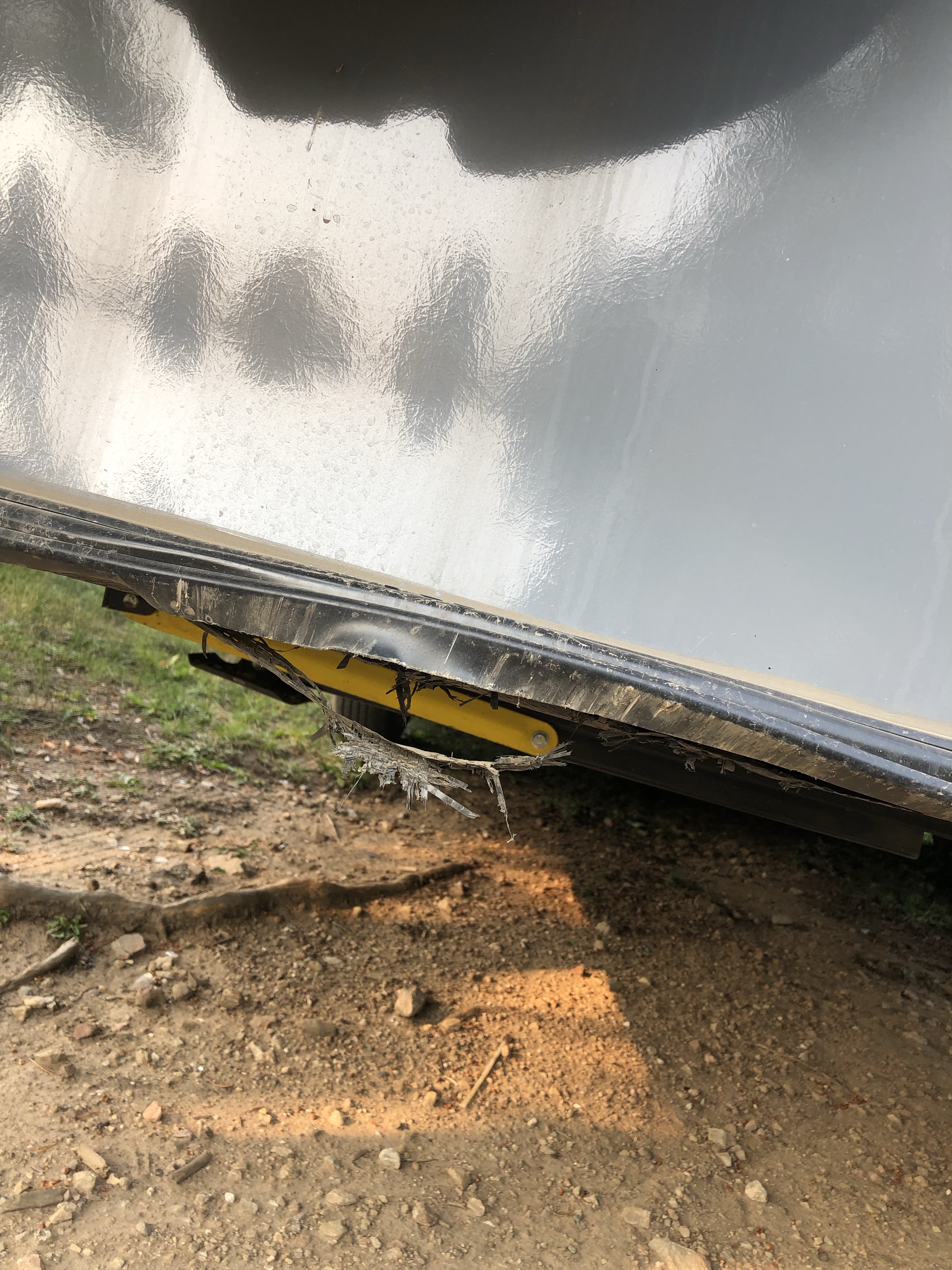 We traveled to the road we ended up camping at after that event last year which was basically a parking lot for ATVs that said no overnight camping. 😬 How we didn’t get in trouble staying there twice last year I have no idea. This time though I did some research and found we could continue up the road and there were actual camping sites. They just failed to mention the road wasn’t fit for trailers. 🤦🏻♀️ So we wandered up a very humpy dirt road which dragged our brand new trailer demolishing the stairs, our jacks and the back end.