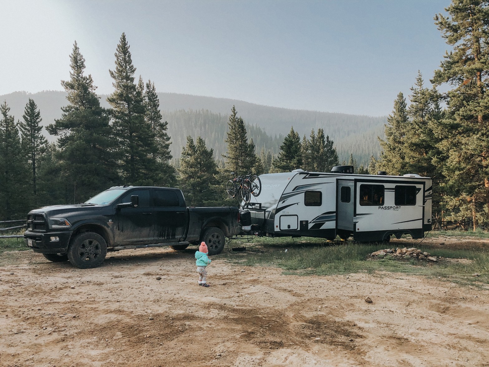 If you know anything about our trip last year you may remember our story of trying to boondock in Breck up a sketchy road as it was getting dark and the trailer falling off into a creek and Matt miraculously pulling us out only to have bent all our stabilizer jacks underneath. Well ….. Breck got us again.